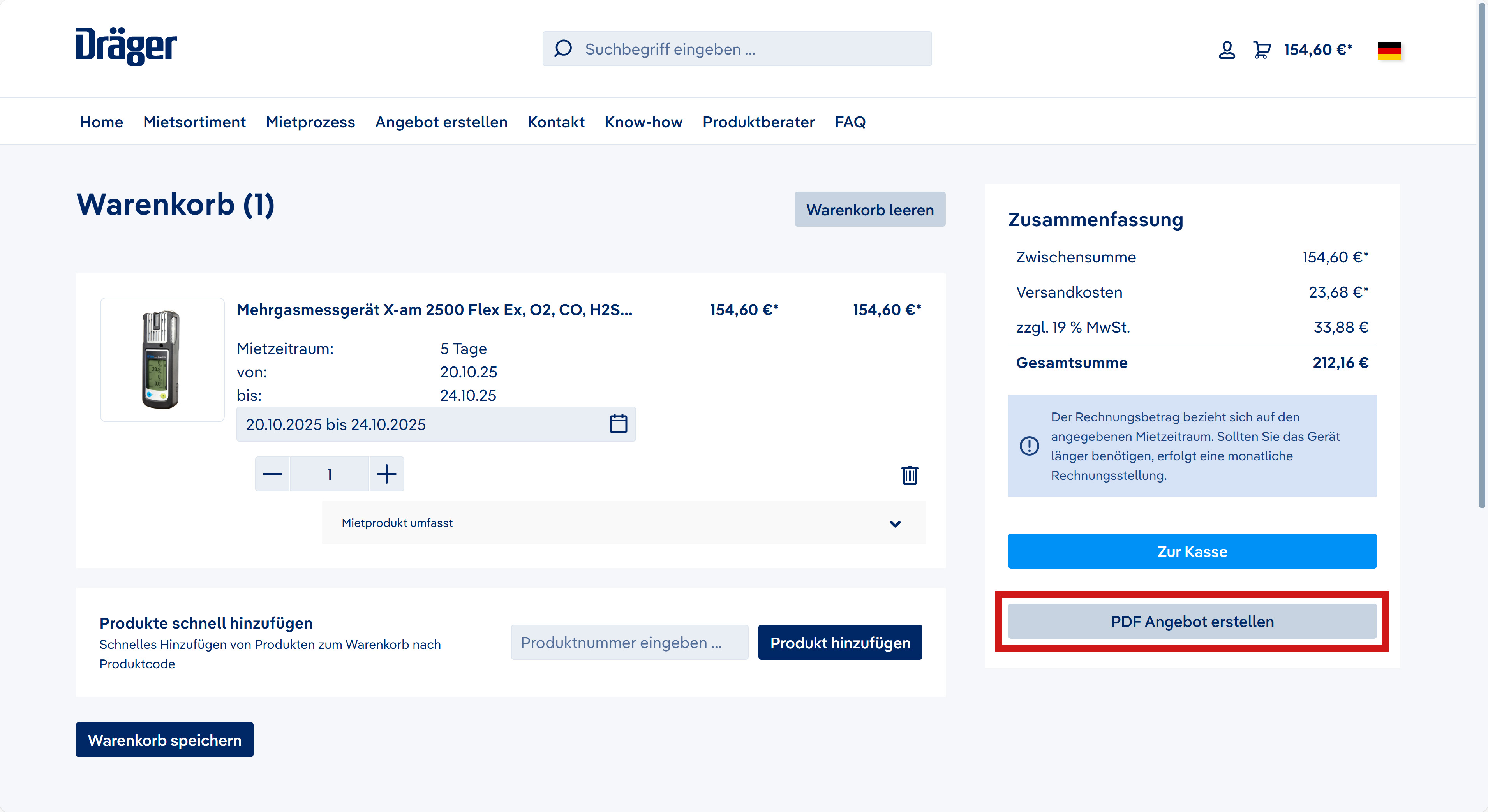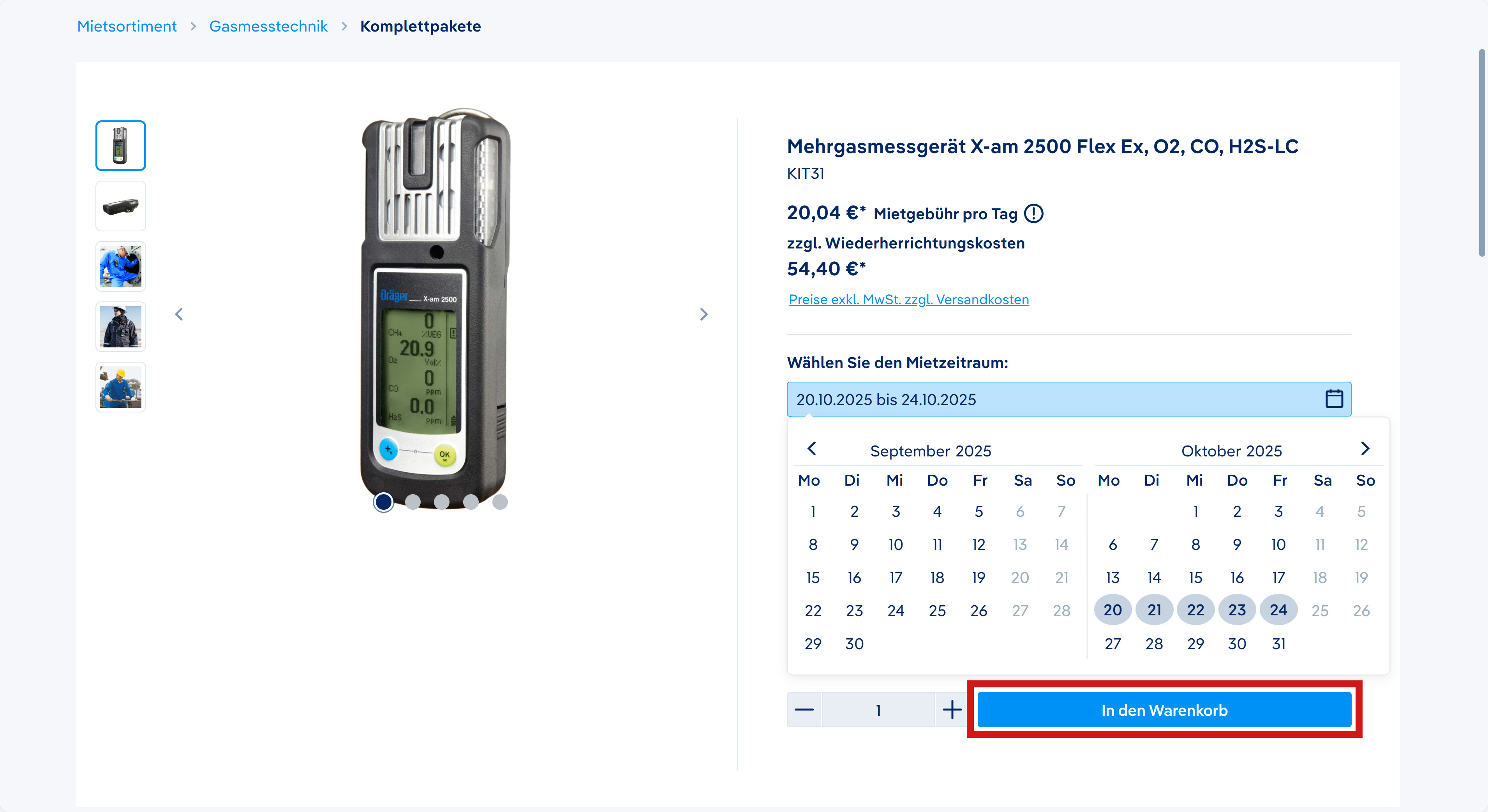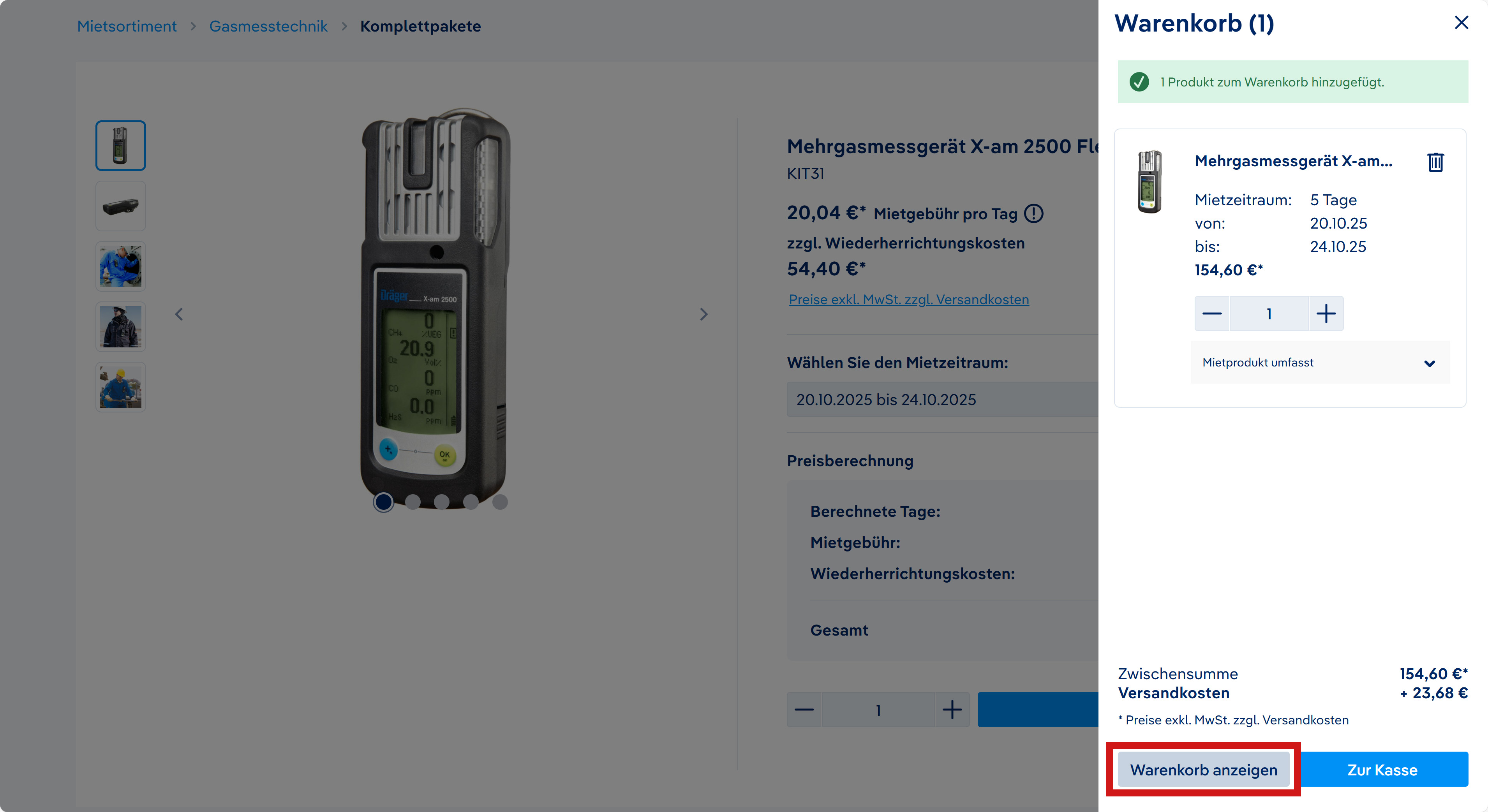 1. Fügen Sie Ihre gewünschten Mietprodukte zum Warenkorb hinzu.